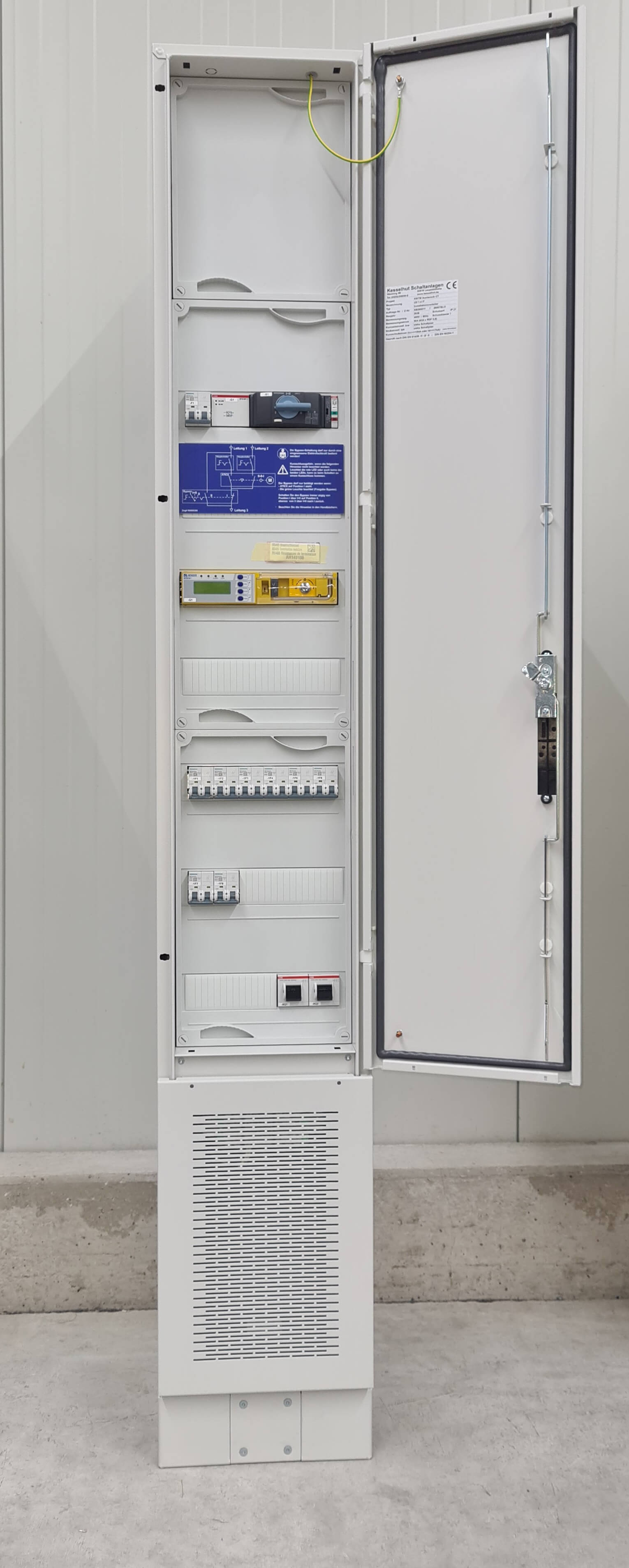 - Aufbau: Transformator im unteren, Schutz- und Anschlusskomponenten im oberen Schaltschrankbereich